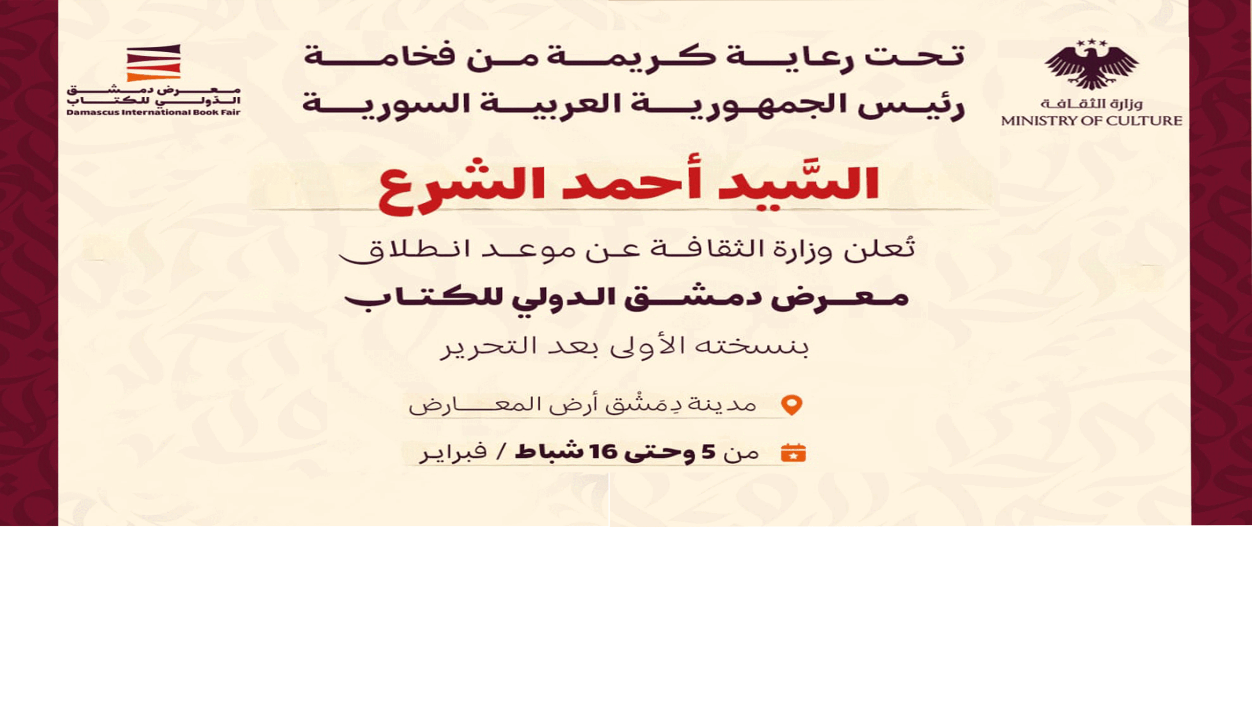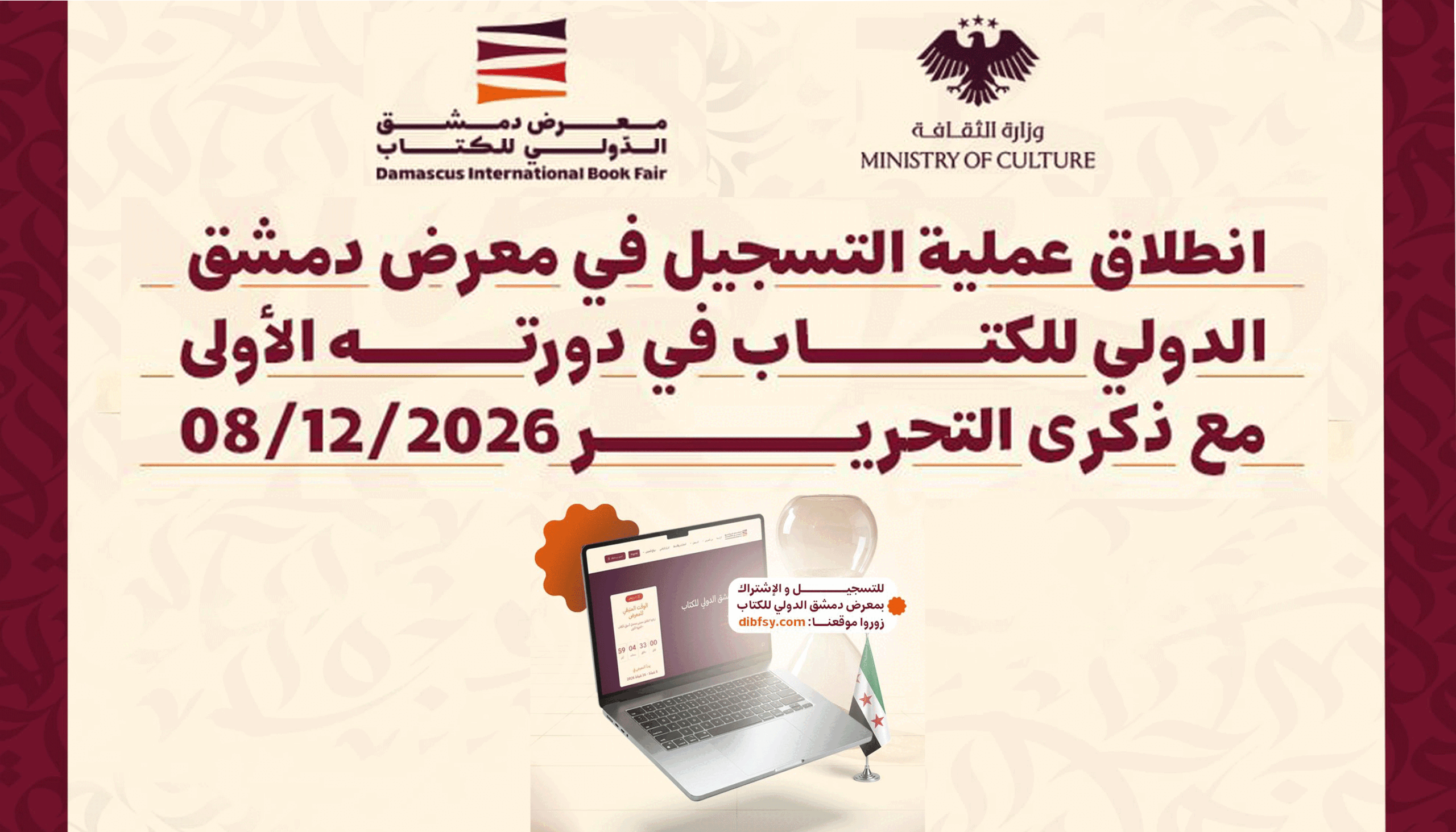 تم اطلاق التسجيل للمشاركة في معرض دمشق الدولي للكتاب 2026 من خلال الرابط التالي: https://dibfs.com. ولأي استفسار بشأن معرض دمشق الدولي للكتاب فبراير 2026 الرجاء التواصل على الرقم المخصص 264 558 987 963+